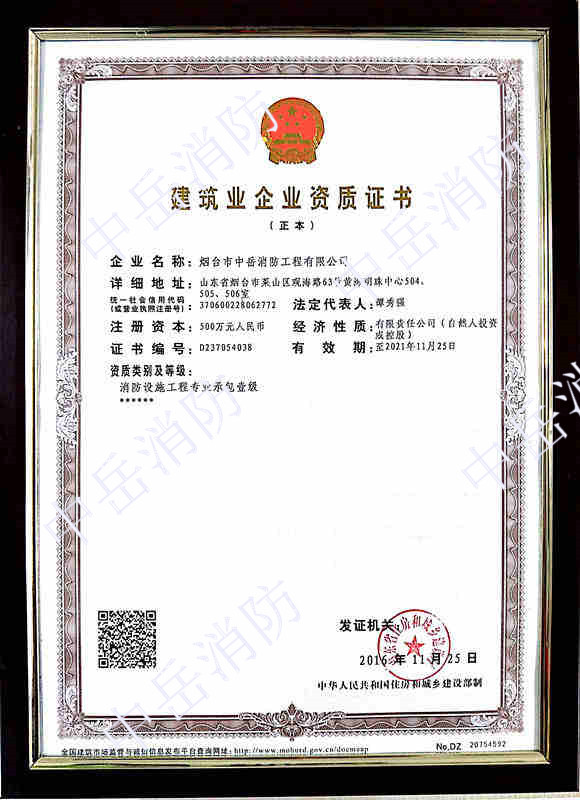 2016年11月25日我公司順利通過了山東省住房和城鄉(xiāng)建設(shè)廳的審核,晉升為消防設(shè)施工程專業(yè)承包壹級(jí)資質(zhì)!